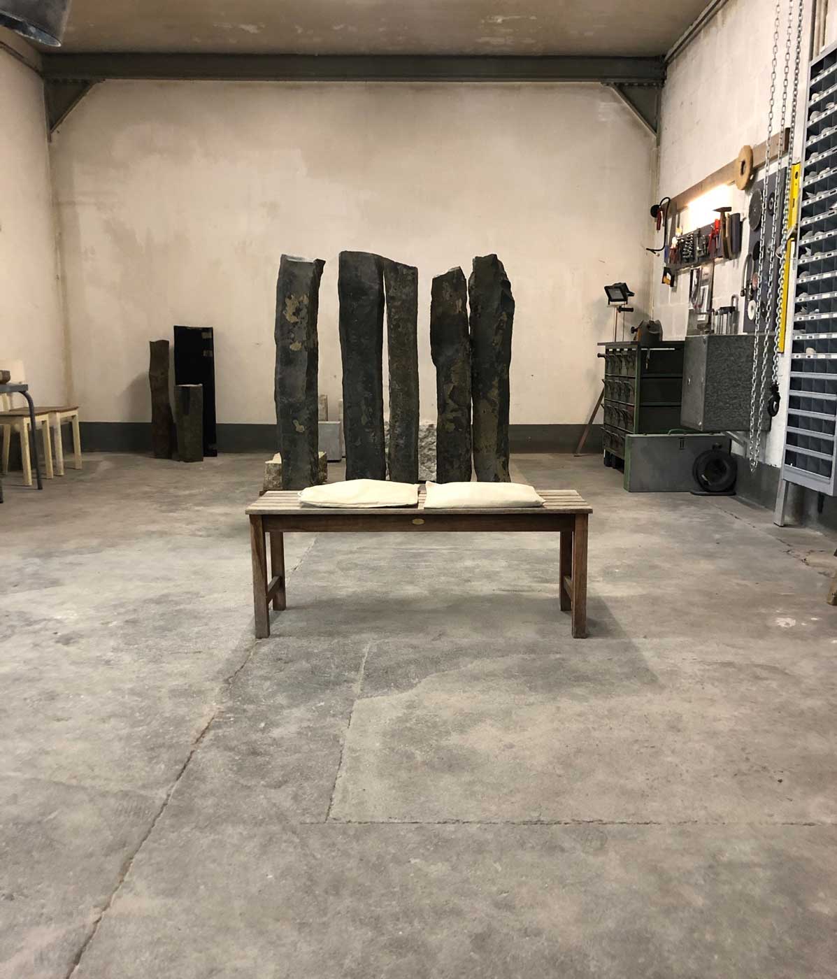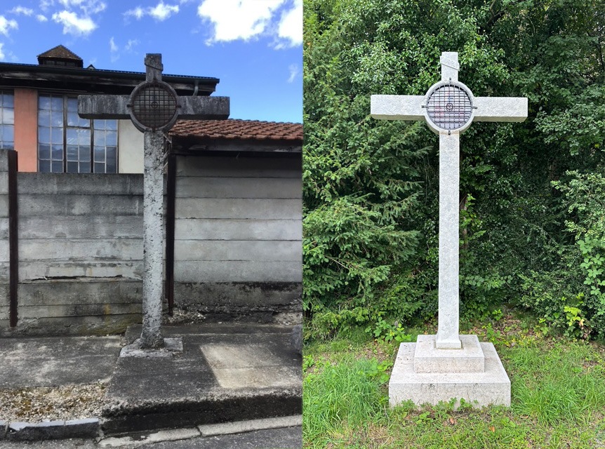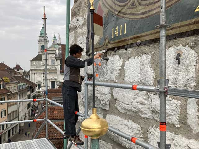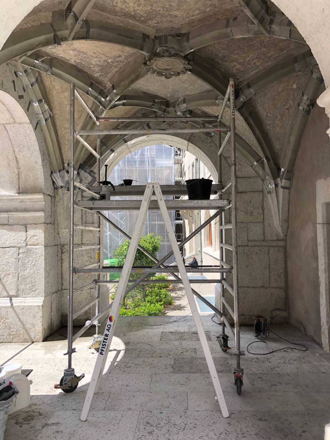 Restaurierung einer Kalksteintreppe an einem denkmalgeschützten Gebäude in der Schweiz.